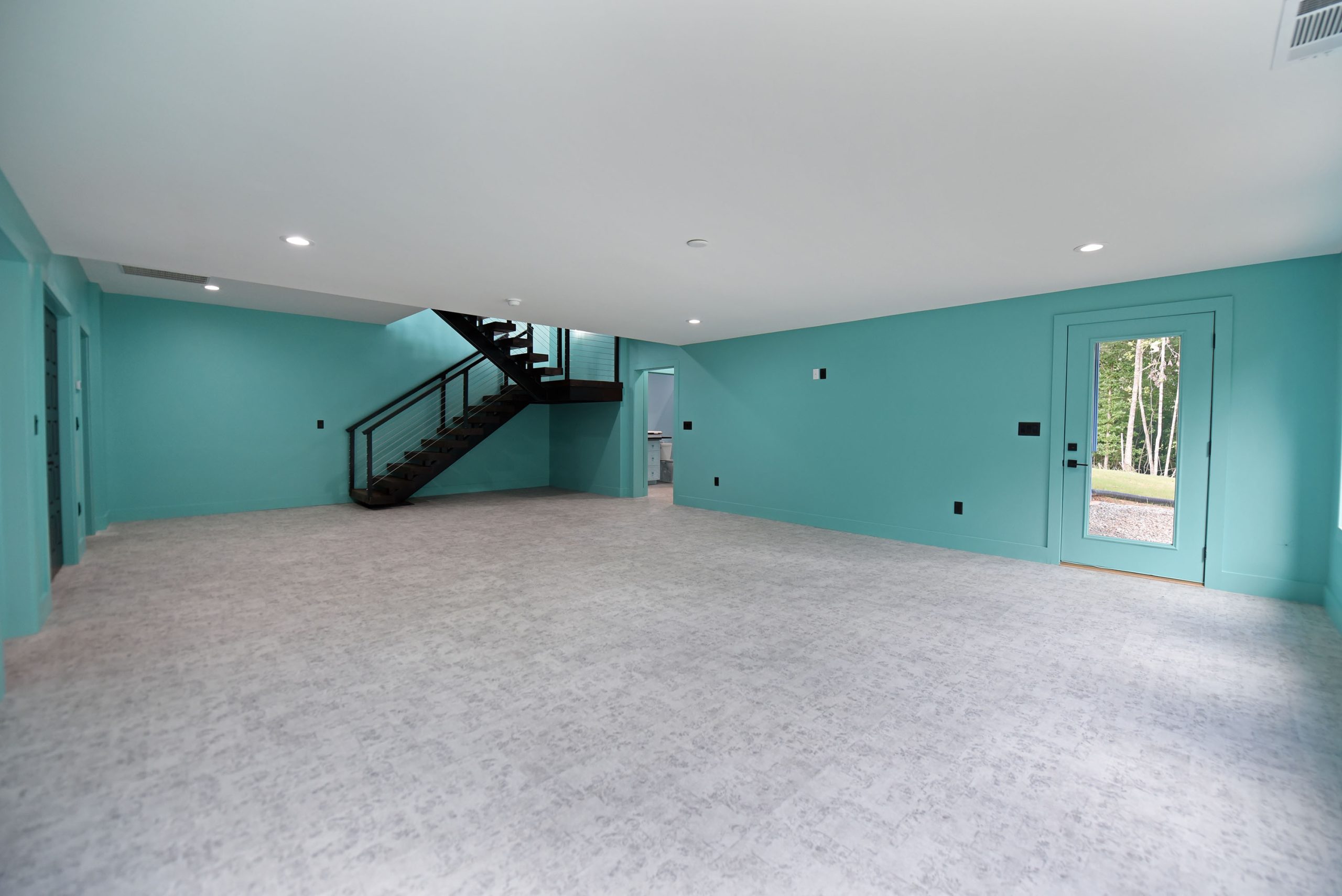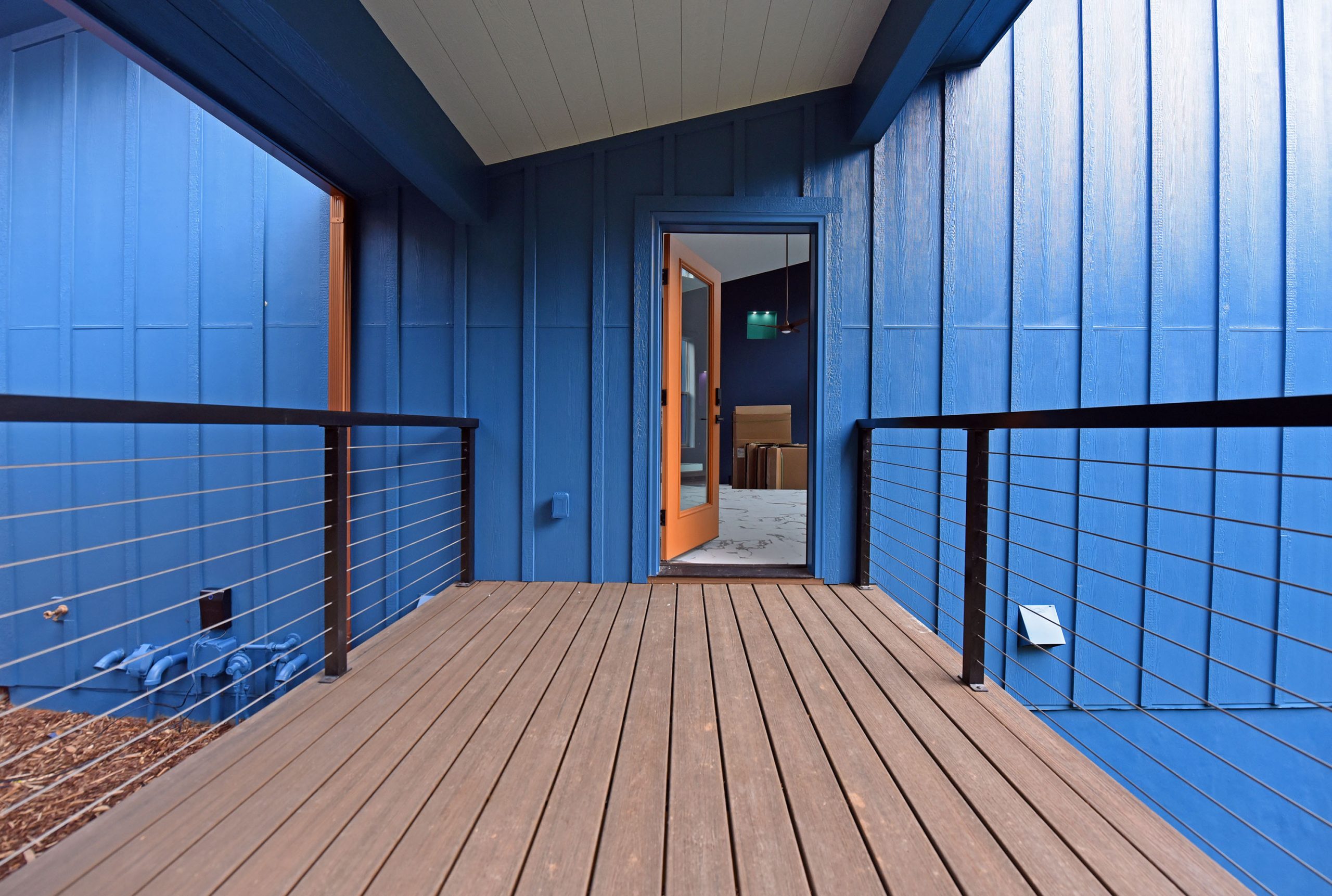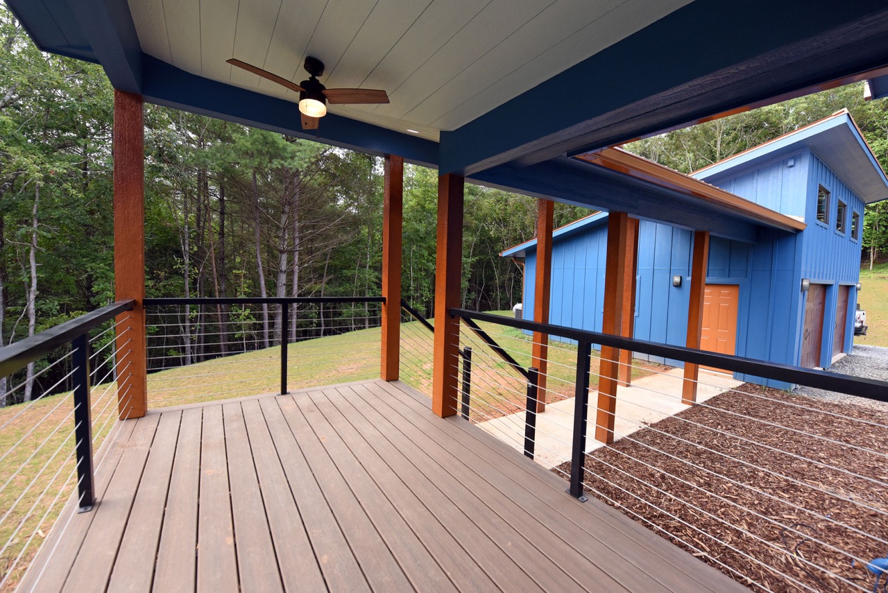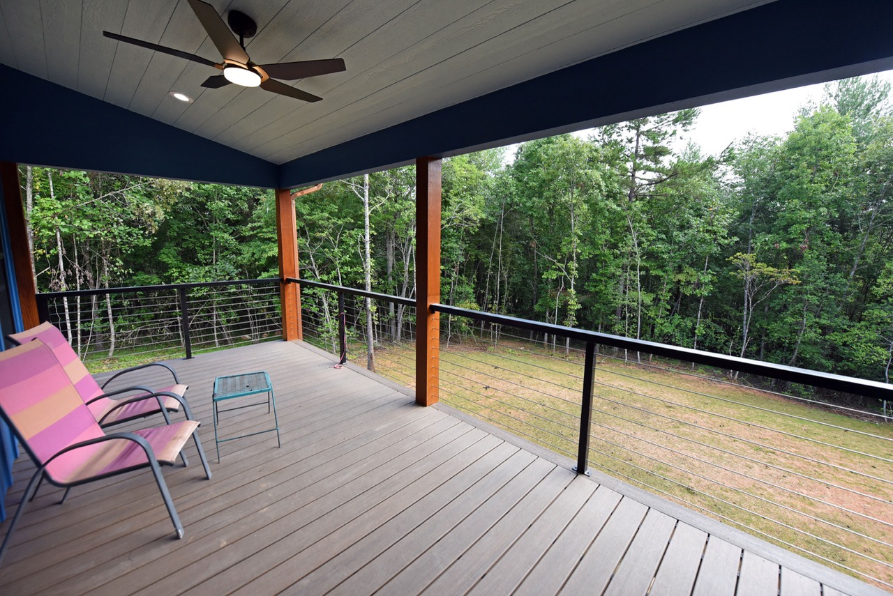 The exterior of this home is just as impressive, featuring low-maintenance features like metal roofing, Trex decking, and board & batten siding. The powder-coated aluminum railings, accented with stainless steel cables, provide a sleek and contemporary touch.